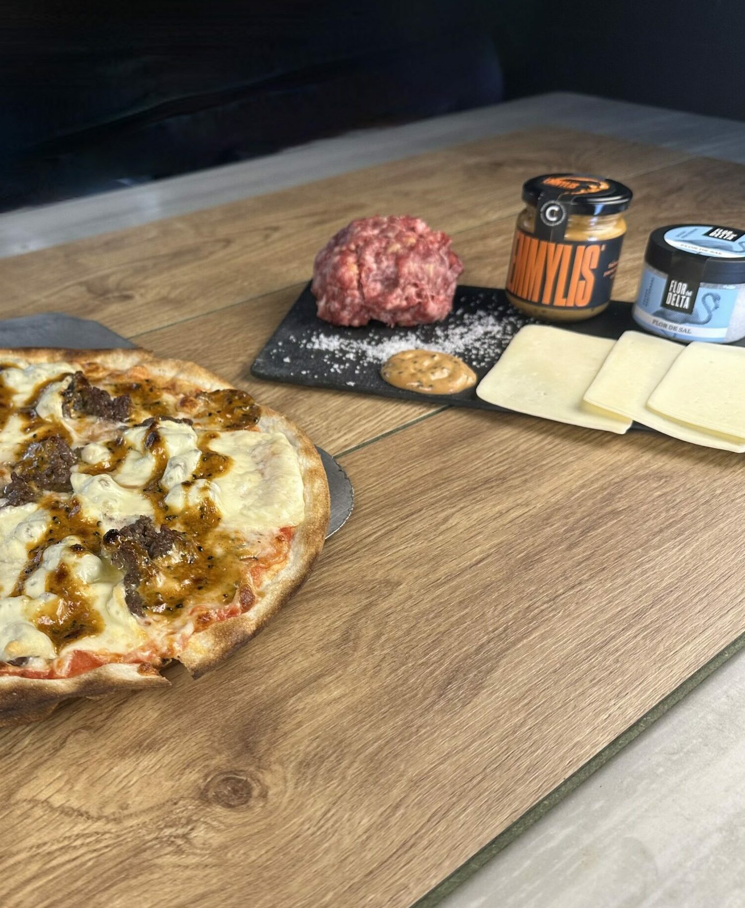 Mozzarella fior di latte, tomàquet passatta, carn de vaca madurada 75 dies (by Carnisseria Català), formatge Cadí Crema i Salsa Emmy (by Carnisseria Català) , i un toc de Flor de Sal del Delta de l’Ebre.